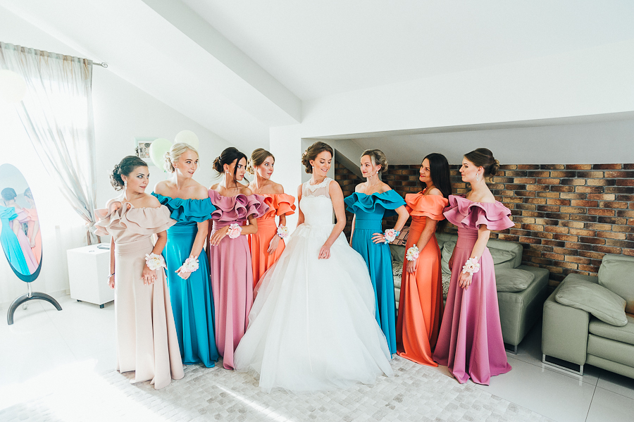 В этом году тенденция единого цветового решения свадьбы уже уходит на второй план, "жёлтые", "красные" и свадьбы "цвета Тиффани" уступают место просто стильным свадьбам вне конкретной тематики и цвета, где все элементы гармонируют друг с другом. Это же касается и нарядов подружек невесты - не обязательно одевать их всех в яркие платья одного цвета, достаточно выбрать одинаковую длину платья, материал и ограничиться выбором любого цвета, к примеру, в пастельной гамме, и тогда все будут выглядеть индивидуально, но при этом идеально сочетаться друг с другом.